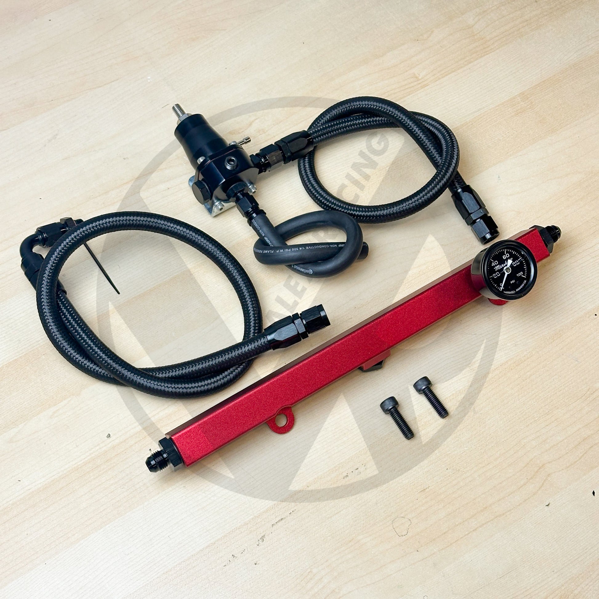 This is a complete K-swap fuel rail system, which includes pre-assembled fuel lines, red fuel rail, Marshall fuel pressure gauge and an Aeromotive style fuel pressure regulator. Buy the complete kit and save.